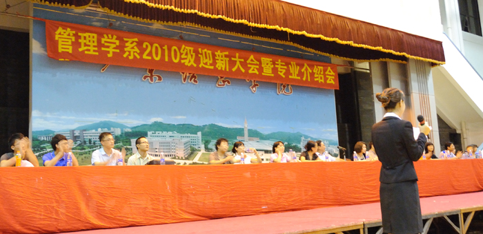 本网讯(管理学系 王莉)9月13日晚,管理学系在体育馆2楼召开了2010级迎新大会暨专业介绍会。管理学系主任张韵君,办公室主任、系党总支书记王莉,各专业教研室主任、辅导员,753名新生参加了会议。  会上,张韵君主任介绍了管理学系的历史沿革与成绩,鼓励同学们珍惜大学美好时光,把自己打造为德才兼备、全面发展的人才。王莉老师结合我院的实际情况就“如何适应大学生活”为全体新生做了讲解,希望同学们能尽早进入大学生的角色。各专业教研室主任一一向2010级新生介绍了各专业的具体情况,让新生对专业有了一个初步的认识,并勉励同学们要学好专业知识,培养应用能力。 老生代表2007级人力资源管理专业学生――获得“2010年共青团广东省五四优秀团员”称号的李灼同学以自己充实的大学生活和经历与师弟师妹交流了心得体会。他建议,师弟师妹要做好学业和职业规划,才不会虚度大学时光。 |