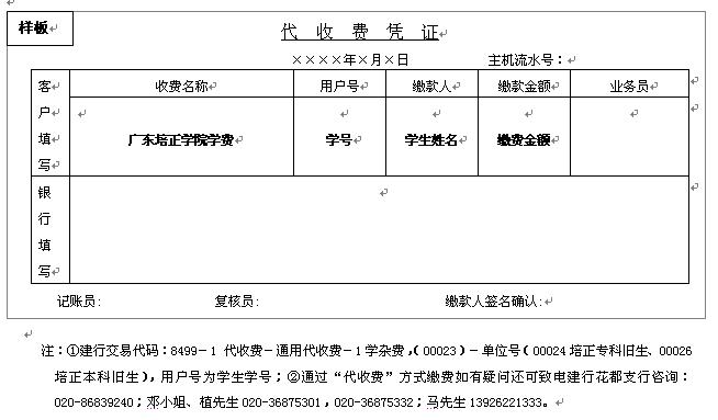 一、 缴费方式: (一)通过建行“代收费”方式缴费(学院极力推荐): 1、同学们于8月25日前到广东省内(深圳地区除外)任一间建设银行营业网点按 以下样板自行填写《代收费凭证》: