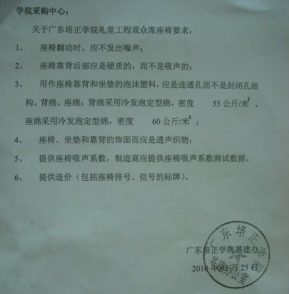 广东培正学院就采购礼堂椅项目进行招标,现接受合格的国内投标人投标。 一、 招标内容 1、礼堂椅880位,请按附件中所示的用料规格,材质,尺寸等制作样板(产品造型不限),并单独报价。(必须严格按照图纸要求报价和提供评标所需样板,每个厂家可以选送样板1-3个). 2、投标厂商均需随标书一起送本厂的样板到我院指定的场地展示,请自备搬运安装人员。 二、 投标人资格要求 1、在广东省设有正式注册服务机构的法人或其他组织; 2、必须为投标产品的生产厂家或代理经销商; 3、若投标人为代理经销商,必须持有厂家出具的代理证书、《授权投标确认书》等证明材料,并由厂家承担对代理商提供的产品及服务质量的保证责任,若代理商无法提供售后服务时,将由厂家负责提供招标文件中及合同书中要求的售后服务,并出具证明; 三、 投标单位提供的文件内容包括: 1、投标单位简介; 2、明细报价,结算方式,相关图纸,施工工期(包括制作工期,现场安装工期),售后服务等内容,请放在公司简介页后面,以利查找; 3、营业执照、税务登记证正副本复印件及其他资质证书复印件(加盖本企业法人公章); 4、座椅吸声参数测试数据的资料; 5、验收方法:按双方签订合同和图纸中的各项要求进行验收。 6、其他需要说明及展示投标单位实力的资料。 四、所有投标书一式五份均应密封并有专人在2010 年6月4日下午5点之前送达广东培正学院采购中心(送标书时带营业执照副本原件),随送样板安装完毕,否则将作为废标处理。 五、 开标:时间2010年 6月 上 旬,由我院组织评标小组开标讨论,中标结果将公布于学院校园网采购中心主页(http://www.peizheng.net.cn/cgzx/Index.html),请留意查询。 六、 其他 1、 所有样品由投标单位在按甲方通知后起七个工作日内自行取回,如不按期搬走则视为赠送学院,不予退还。 2、 投标单位对因产品质量隐患所造成的任何事故负有永久的责任。 3、 最后确定为中标的投标单位须承诺:交付合同总金额10%的履约保证金,不得提出撤回投标,并在规定的时间内完成该项目,否则按违约论处,同意被甲方罚没全部履约保证金 4、 安装期间如有损坏我院的任何设备及物品需照价赔偿,安装过程中所用水电及食宿由投标单位自行负责。 5、 投标联系电话:86842284 联系人:赖主任、李老师 6、 本次招标的解释权归广东培正学院采购中心。
